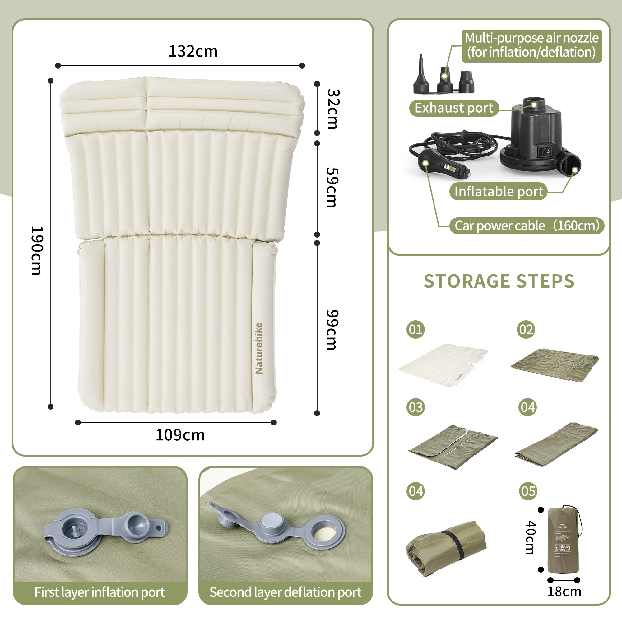 Experience ultimate comfort on your next road trip with the Naturehike Car Mounted Inflatable Bed. This ultra-lightweight cushion is made from high-quality suede TPU and Chunya Textile. ensuring durability and support while you rest. With a compact storage size of 18*40cm and an inflation size of 190*132*10cm. this bed is the perfect travel companion.